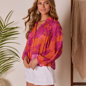 Remeah Print Pleated Chiffon Top
