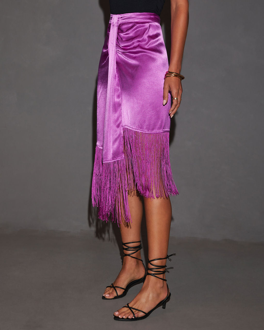 Soleni Satin Fringe Hem Midi Skirt