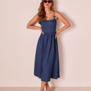 Be the first to review “Tide To Me Bow Strap Midi Chambray Dress”